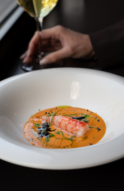 Low temperature pork belly with red shrimp carpaccio, spring onion and lime